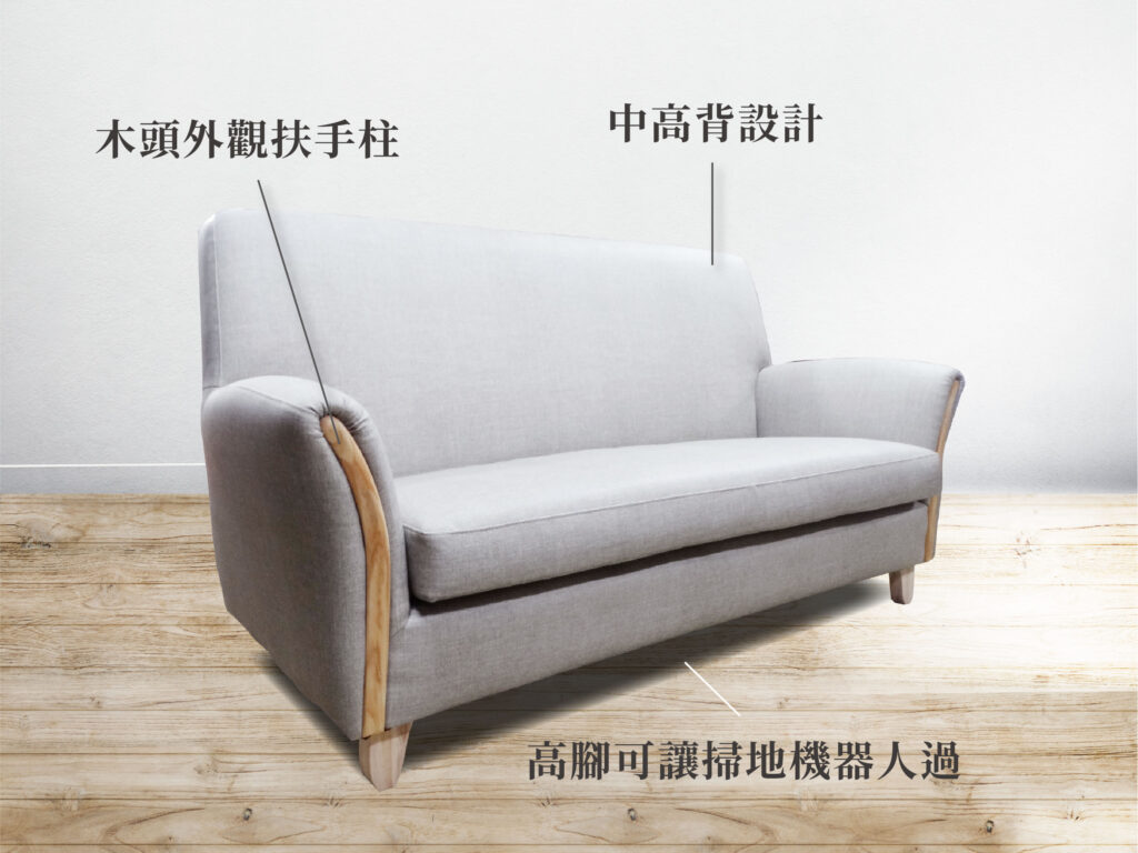 原木質感的扶手柱和沙發腳,營造木質溫馨氣氛,讓空間整體更令人放鬆自在